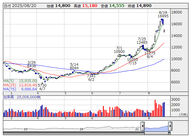 SBG <日足> 「株探」多機能チャートより■ソフトバンクグループ <9984> 14,890円 (-1,145円、-7.1%)