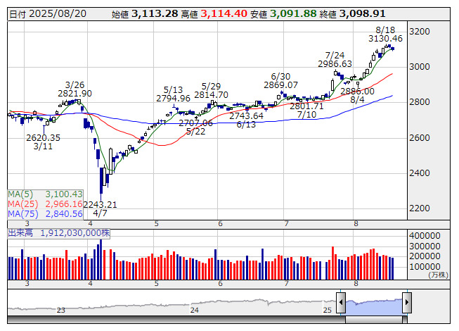 TOPIX <日足> 「株探」多機能チャートより3263.73ポイント ボリンジャーバンド3σ