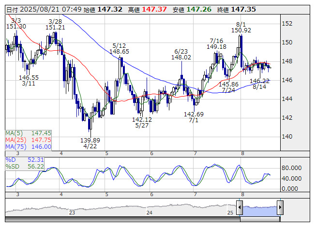 米ドル/円 <日足> Slowストキャス 「株探」多機能チャートより20日のドル・円は、東京市場では147円82銭から147円14銭まで下落。欧米市場では147円64銭まで買われた後、一時146円87銭まで下落したが、147円35銭で取引終了。本日21日のドル・円は主に147円台で推移か。米長期金利の上げ渋りを意識してドルは伸び悩む可能性がある。