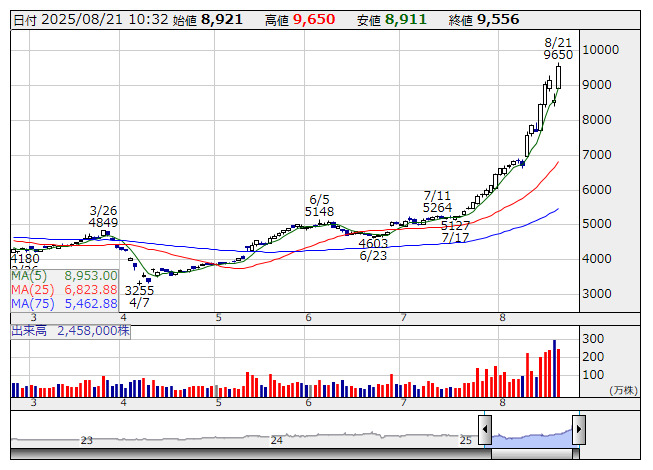 三井金 <日足> 「株探」多機能チャートより三井金<5706>は急反発。前日に高周波基板用電解銅箔「VSP」の生産体制追加増強を発表した。同社の「VSP」は、高周波数帯におけるプリント基板の伝送損失低減に大きく寄与することから、サーバー、ルーター、スイッチ等の高性能通信インフラ機器に採用されている。足元ではAIインフラ関連、特にHVLP5グレード品が開発から量産フェーズに移行するなど、需要が当初の計画以上に加速度的に増加しており、今後も更なる拡大が期待さる。台湾工場とマレーシア工場の両工場580t/月体制から、2026年9月までに45%増の 840t/月体制とするようだ。