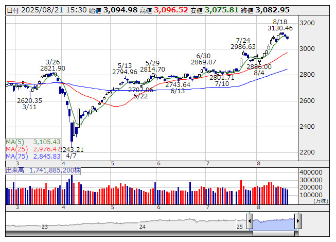 2025年08月21日15時47分 【市況】TOPIX先物:21日清算値=21ポイント安、3083.5ポイント TOPIX <日足> 「株探」多機能チャートより 21日15時45分、TOPIX先物期近2025年9月限は前日清算値比21ポイント安の3083.5ポイントで取引を終えた。出来高は4万1515枚だった。この日のTOPIXの現物終値3082.95ポイントに対しては0.55ポイント高。 株探ニュース