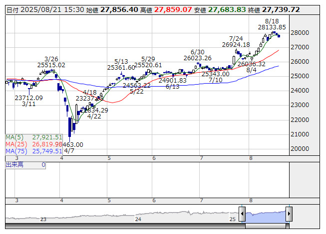 2025年08月21日15時47分 【市況】JPX日経400先物:21日清算値=155ポイント安、2万7755ポイント JPX日経400 <日足> 「株探」多機能チャートより 21日15時45分、JPX日経インデックス400先物期近2025年9月限は前日清算値比155ポイント安の2万7755ポイントで取引を終えた。出来高は2453枚だった。この日のJPX日経インデックス400の現物終値2万7739.72ポイントに対しては15.28ポイント高。 株探ニュース