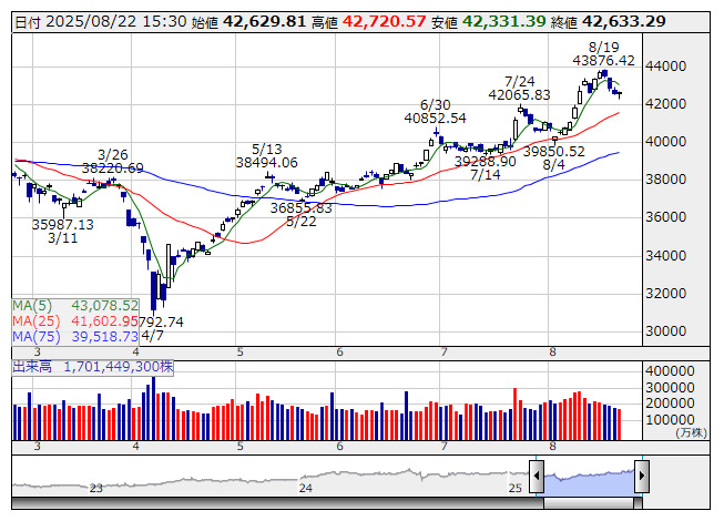 日経平均 <日足> 「株探」多機能チャートより日本取引所が公表した先物手口情報によると、8月22日の日経225ミニ期近(2025年9月限)の日中取引(立会内・J-NETの合算)で、取引高トップはABNクリアリン証券の17万9370枚だった。