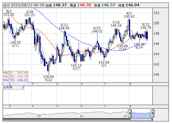 米ドル/円 <日足> 「株探」多機能チャートより■弱含み、ポンド買い・スイスフラン売り増加の影響も