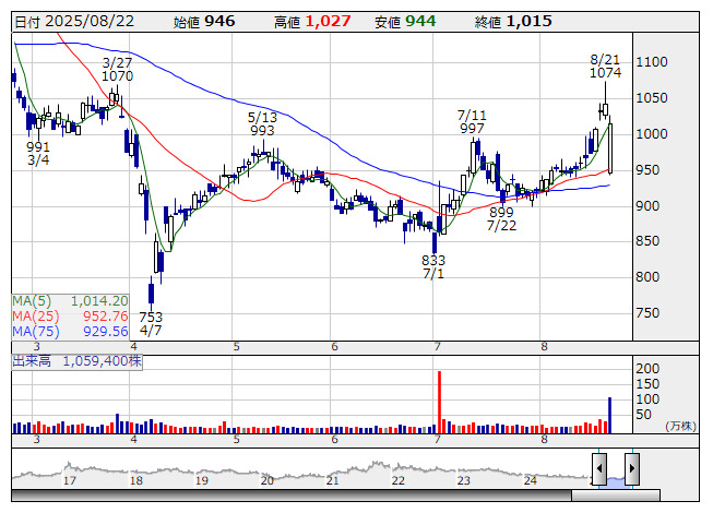 エアトリ <日足> 「株探」多機能チャートより銘柄名<コード>22日終値⇒前日比