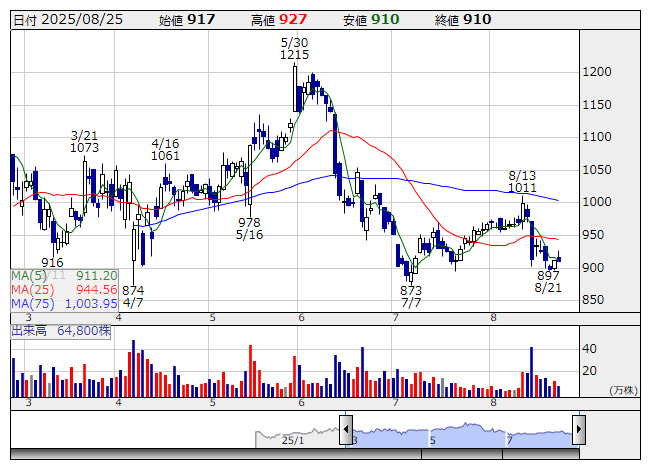 7月30日にマドを空けて急伸し、8月1日には3100円まで買われた。その後は調整を継続していたが、上向きで推移する25日線が支持線として機能する形でリバウンドをみせてきている。一目均衡表では雲を上回っての推移が続いており、基準線が支持線として機能するなかで、転換線を突破してきた。遅行スパンは上方シグナルを継続。パラボリックは足もとの調整で陰転シグナルを発生させたが、SAR値は2987円辺りまで下がってきており、陽転シグナル発生へのハードルは高くない。