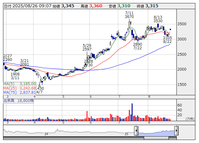 NVDA>のエリートパートナーの認定を獲得しており、エヌビディア関連の一角としても存在感を示す。そうしたなか、25日取引終了後に最新の高性能GPUである「NVIDIA RTX PRO 6000 Blackwell Server Edition」を搭載した「NVIDIA RTX PRO サーバー」の提供を開始したことを発表、これを材料視する買いを引き寄せている。