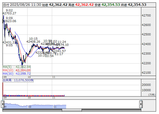 【市況】日経225先物:26日正午=480円安、4万2290円