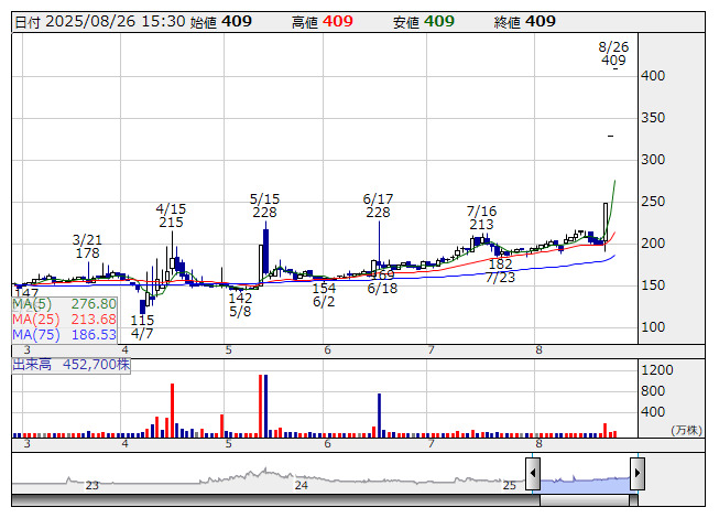 一方、堀田丸正<8105>がストップ安。CAICA DIGITAL<2315>、fonfun<2323>、京都きもの友禅ホールディングス<7615>、GFA<8783>は一時ストップ安と急落した。和弘食品<2813>は年初来安値を更新。ネクスグループ<6634>、マリオン<3494>、アドバネクス<5998>、夢みつけ隊<2673>、サイバーリンクス<3683>は値下がり率上位に売られた。