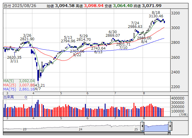 TOPIX <日足> 「株探」多機能チャートより日本取引所が公表した先物手口情報によると、8月26日のTOPIX先物期近(2025年9月限)の夜間取引(立会内・J-NETの合算)で、取引高トップはABNクリアリン証券の7334枚だった。