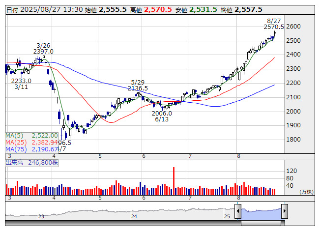 2025年08月27日13時31分 【テク】NOK---2月以来の高値更新で次は17年11月高値を意識 NOK <日足> 「株探」多機能チャートより <7240> NOK 2557.5 +38.5 順調なリバウンド基調を継続するなかで2570.5円まで買われ、2月6日につけた高値(2565円)を突破してきた。ダブルトップ形成が意識され、いったんは利食いが入りやすいところであるが、同水準を明確に上抜けてくるようだと、2017年11月高値の2900円辺りが次のターゲットとして意識されてきそうだ。 《FA》 提供:フィスコ
