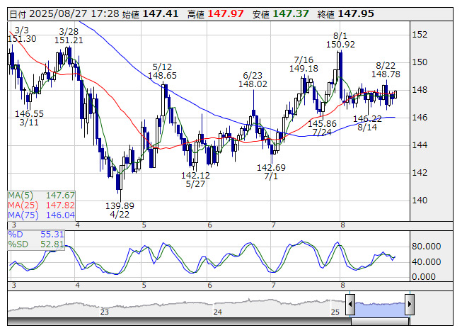 米ドル/円 <日足> Slowストキャス 「株探」多機能チャートより今晩は目立った経済指標の発表などは予定されていない。このなか、今晩の米株式市場の取引終了後にエヌビディアの決算が発表される。株式市場での注目度は高く、その結果次第では為替相場にも影響が出ることもあり得る。明日は日銀の中川審議委員が金融経済懇談会での挨拶を予定している。