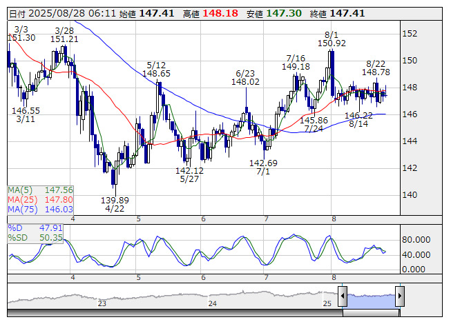 米ドル/円 <日足> Slowストキャス 「株探」多機能チャートより27日のニューヨーク外為市場でドル・円は148円14銭から147円29銭まで下落し、147円47銭で引けた。米NY連銀のウィリアムズ総裁発言や米5年債入札の結果を好感し、米国の長期金利が低下に転じ、ドル売りが優勢となった。