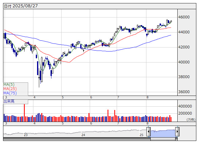 注目されたエヌビディアの決算では、8~10月期の売上高見通しが一部アナリストの予測には届かず、時間外取引で3%あまり下落して推移している。5~7月期の事業別売上高は、データセンター部門が411億ドルと、予想の413億ドルをやや下回った。そのため、指数インパクトの大きい値がさハイテク株やAI関連には売りが先行する形になり、日経平均株価を押し下げる可能性はありそうだ。