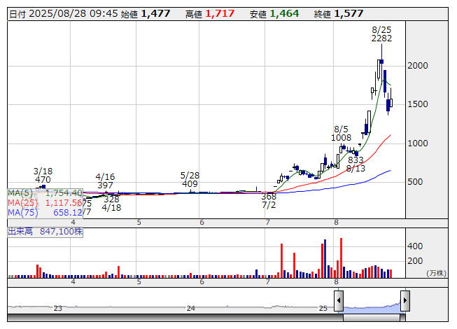 2025年08月28日09時45分 【材料】ビーマップは一時S高、「おうちモニタ」新機能開発が補助金事業に採択 ビーマップ <日足> 「株探」多機能チャートより ビーマップ<4316>が4営業日ぶりに反発し、一時ストップ高まで買われた。同社は27日、電力使用データを活用した見守りサービス「おうちモニタ」の新機能の開発が、資源エネルギー庁の「再生可能エネルギー導入拡大・分散型エネルギーリソース導入支援等事業費補助金(電力データ活用支援等事業)」の対象として採択されたと発表。これが買い手掛かりとなっているもよう。 また、宇宙・防衛関連としての人気も根強い様子。今月13日には、宇宙・防衛事業の業務提携先であるSpicyCompany(東京都渋谷区)の米現地法人と共同で、北マリアナ諸島サイパン島に「宇宙防衛通信研究所」を設立することを明らかにしている。 出所:MINKABU PRESS