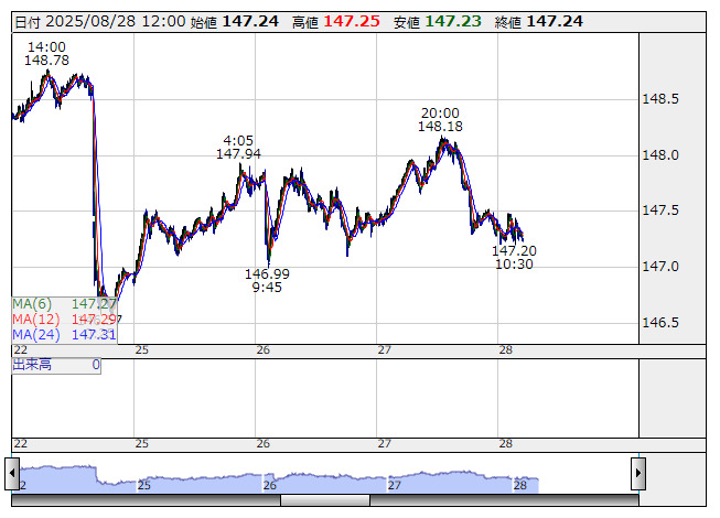 2025年08月28日12時01分 【通貨】外為:1ドル147円23銭前後と大幅なドル安・円高で推移 米ドル/円 <5分足> 「株探」多機能チャートより 28日の外国為替市場のドル円相場は午後0時時点で1ドル=147円23銭前後と、前日午後5時時点に比べ53銭の大幅なドル安・円高。ユーロ円は1ユーロ=171円57銭前後と13銭のユーロ高・円安で推移している。 株探ニュース