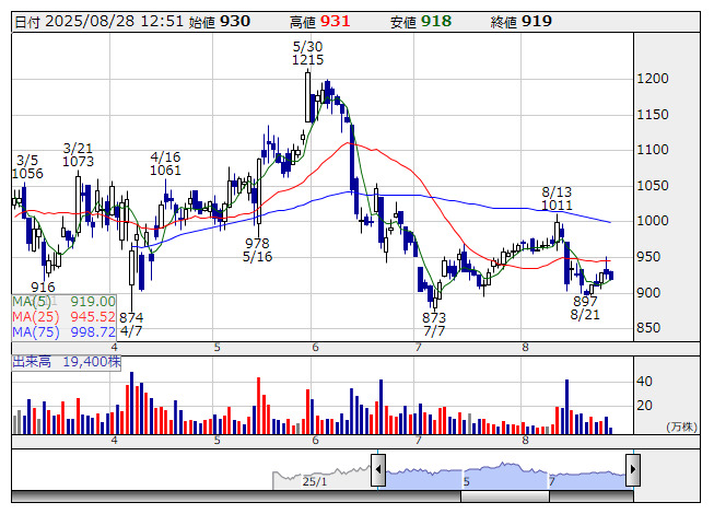 ユカリア <日足> 「株探」多機能チャートより28日の東証グロース市場でユカリアが続落。同社は医療法人の経営支援や高齢者施設の運営・紹介を行っている。25日取引終了後、ツナググループ・ホールディングス<6551>との戦略的業務提携契約に基づく共同事業の第2弾として、ユカリア子会社のクラーチに対する採用支援を9月に開始すると発表した。これを受け、26日の株価は上昇したが、その後は軟調な値動きとなっている。25年12月期の連結営業利益は前年同期比27.6%増の29億2500万円と最高益が予想されており、株価には再評価期待も出ている様子だ。