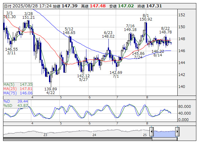 前日の取引で材料が乏しいなか連邦準備制度理事会(FRB)理事の解任報道やそれに伴う法的対応を受け、米金利安・ドル安に振れた。ユーロ・ドルは1.1580ドル付近から1.16ドル台半ばまで強含み、ドル・円は148円20銭付近から147円20銭台へと約1円も水準を切り下げている。本日アジア市場で日経平均株価の上昇も、PCEコア指数など経済指標を待つ姿勢が優勢となり、ドル・円はドル買い後退で小幅に値を下げた。