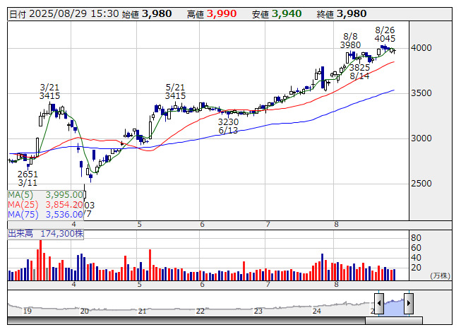 2025年08月29日18時50分 【市況】本日の【株式分割】銘柄 (29日大引け後 発表分) 第四北越FG <日足> 「株探」多機能チャートより ●第四北越FG <7327> [東証P] 9月30日現在の株主を対象に1→3の株式分割を実施。最低投資金額は現在の3分の1に低下する。 ●エリアリンク <8914> [東証S] 10月31日現在の株主を対象に1→2の株式分割を実施。最低投資金額は現在の2分の1に低下する。 [2025年8月29日] 株探ニュース