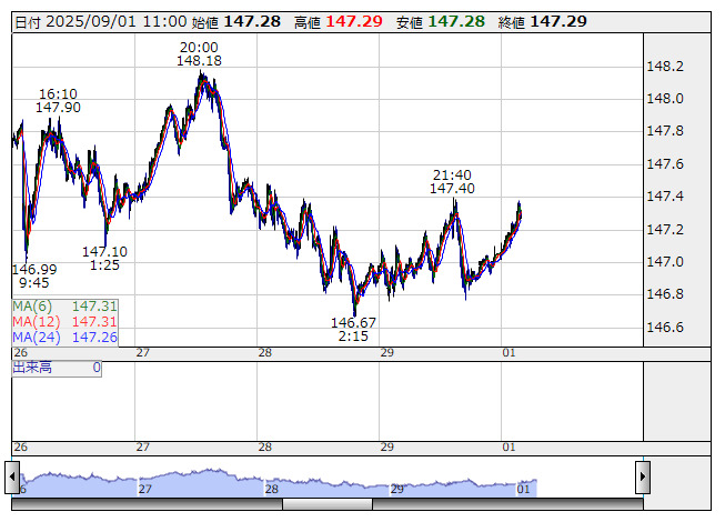 2025年09月01日11時01分 【通貨】外為:1ドル147円28銭前後とドル高・円安で推移 米ドル/円 <5分足> 「株探」多機能チャートより 1日の外国為替市場のドル円相場は午前11時時点で1ドル=147円28銭前後と、前週末午後5時時点に比べ28銭のドル高・円安。ユーロ円は1ユーロ=172円25銭前後と61銭の大幅なユーロ高・円安で推移している。 株探ニュース