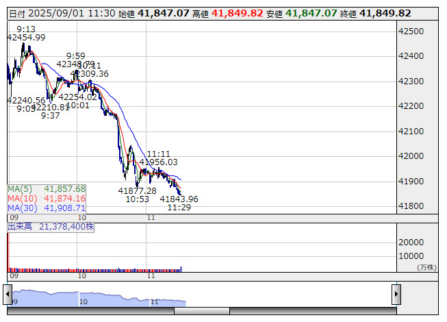 日経平均 <1分足> 「株探」多機能チャートより日経平均 : 41849.82 (-868.65)