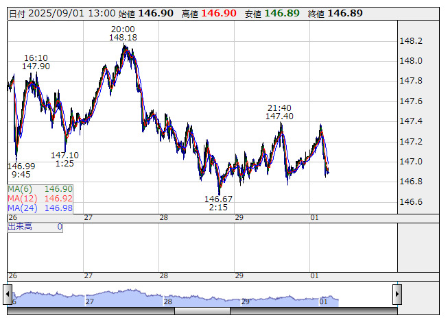 2025年09月01日13時01分 【通貨】外為:1ドル146円89銭前後とドル安・円高で推移 米ドル/円 <5分足> 「株探」多機能チャートより 1日の外国為替市場のドル円相場は午後1時時点で1ドル=146円89銭前後と、前週末午後5時時点に比べ11銭のドル安・円高。ユーロ円は1ユーロ=171円98銭前後と34銭のユーロ高・円安で推移している。 株探ニュース