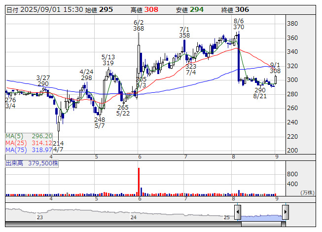 六甲バター<2266>=急速人気で新高値。前週末8月29日取引終了後、ナッツ製品の製造を委託するとともに資本関係にあるミツヤグループ本社(福岡市南区)の株式を追加取得し、完全子会社化すると発表。これに伴い連結決算に移行し、25年12月期の純利益予想を12億円(単独の従来予想6億円、前期単独10億4100万円)に見直しており、これが好感されているようだ。なお、売上高、営業利益予想については単独の従来予想から変更はない。