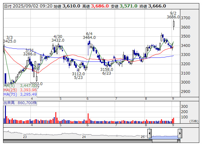 伊藤園 <日足> 「株探」多機能チャートより全国的に記録的な高温・少雨だったことに加えて、前期に先行投資した広告宣伝費の効果もあり、主力の「お~いお茶」「健康ミネラルむぎ茶」ブランドの飲料製品を中心にリーフ・ドリンク事業の売上高・営業利益が好調に推移した。また、北米を中心に「お~いお茶」の海外販売も数量を伸ばした。