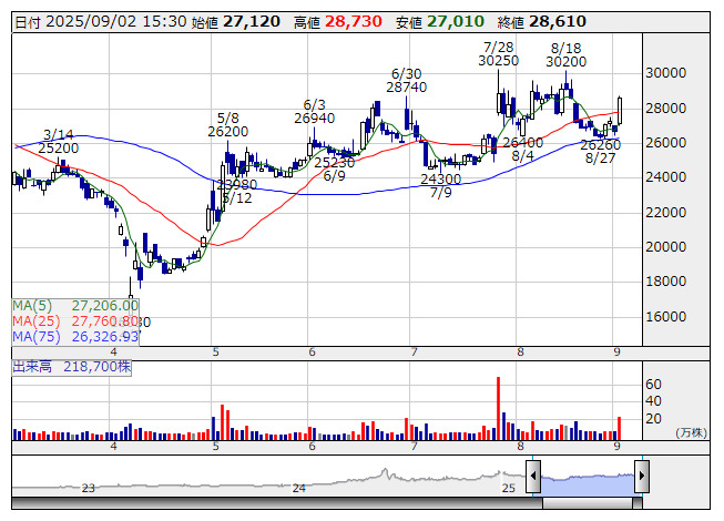 伊勢化 <日足> 「株探」多機能チャートより