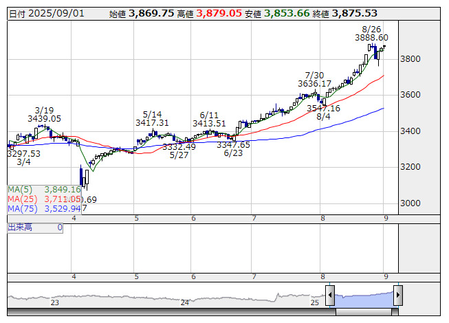 2025年09月02日16時47分 【市況】2日中国・上海総合指数=終値3858.1334(-17.3970) 上海総合 <日足> 「株探」多機能チャートより 2日の中国・上海総合指数の終値は前営業日比17.3970ポイント安の3858.1334と4日ぶり反落。 出所:MINKABU PRESS