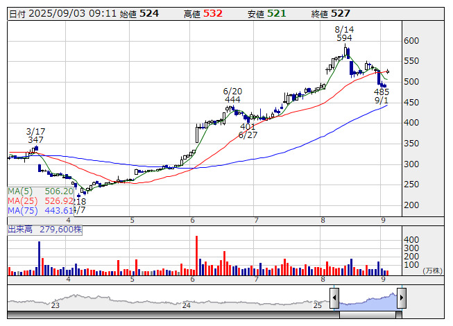 3415>がカイ気配スタートで一気に株価水準を切り上げている。株価は前日まで6日続落と崩れ足をみせていたが、きょうは満を持して急速に切り返す展開となった。ファッション性の高い若年層を主要顧客に「STUDIOUS」や、国内ファッションブランド商品を取り扱う「UNITED TOKYO」などアパレルのセレクトショップを運営するが、足もとの業績は好調に推移している。2日取引終了後に発表した8月既存店売上高は前年同月比17.7%増と2ケタ伸長で10カ月連続で増収を確保した。「UNITED TOKYO」のメンズが好調に推移し全体を牽引している。好調な売り上げ推移を評価する買いを呼び込む形となった。