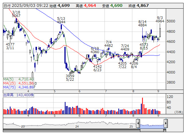 日電子 <日足> 「株探」多機能チャートより医用機器事業の分割準備会社を今月中に設立し、同事業を承継した新会社の株式をシスメックスが取得する。新会社は27年3月期第1四半期(4~6月)に連結範囲から外れる予定。分割する事業の25年3月期売上高は154億1800万円、営業利益は6億6200万円だった。売却価額は非開示とする。日本電子は業界で高いプレゼンスを持つシスメックスの傘下で医用機器事業の運営を図ることが、同事業の今後の持続的な成長と中期的な企業価値の観点から最適だと判断した。