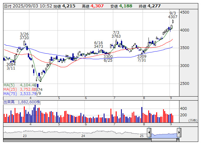 5713>がマドを開けて続伸し新値街道をまい進している。きょうは同社株をはじめ非鉄セクターに資金流入の動きが目立っているが、その背景にはここにきて金市況の上昇が一段と顕著となっていることが挙げられる。金価格は国際指標となっているNY先物がアジア時間3日にフシ目の3600ドル台に乗せ過去最高値を更新した。英国やフランスの財政悪化懸念に加え、米国でもトランプ米政権下でインフレ圧力が意識されるなか、リスク回避の投資マネーが金に向かう傾向が強まっている。金関連銘柄ではこのほか、純金上場信託(現物国内保管型)<