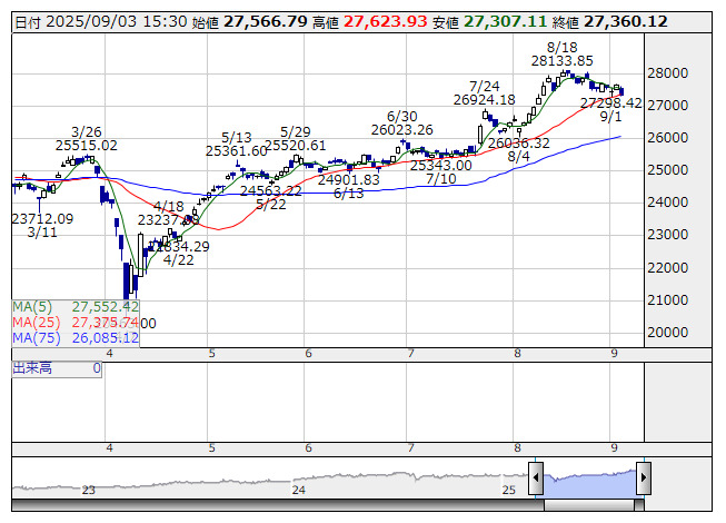 2025年09月03日15時47分 【市況】JPX日経400先物:3日清算値=305ポイント安、2万7380ポイント JPX日経400 <日足> 「株探」多機能チャートより 3日15時45分、JPX日経インデックス400先物期近2025年9月限は前日清算値比305ポイント安の2万7380ポイントで取引を終えた。出来高は3471枚だった。この日のJPX日経インデックス400の現物終値2万7360.12ポイントに対しては19.88ポイント高。 株探ニュース