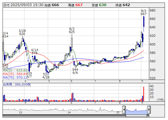 大幅続伸。医用機器事業を新設する子会社に対して会社分割により継承させ、新会社株式をシスメックスに譲渡すると発表している。26年4月1日の株式譲渡を予定している。譲渡価額は非開示。譲渡する会社の25年3月期売上高は154億円、営業利益は6.6億円の水準であるもよう。医療費抑制策の影響などが懸念される分野ではあり、売却による事業の選択と集中をポジティブに評価の動きが優勢のようだ。