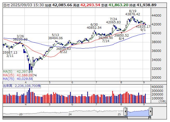 日経平均 <日足> 「株探」多機能チャートより日本取引所が公表した先物手口情報によると、9月3日の日経225ミニ期近(2025年9月限)の日中取引(立会内・J-NETの合算)で、取引高トップはABNクリアリン証券の20万2534枚だった。
