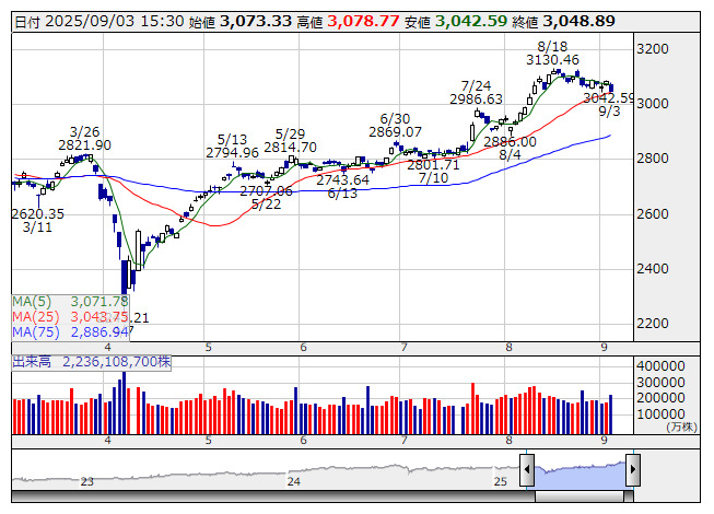 TOPIX <日足> 「株探」多機能チャートより日本取引所が公表した先物手口情報によると、9月3日のTOPIX先物期近(2025年9月限)の日中取引(立会内・J-NETの合算)で、取引高トップはABNクリアリン証券の3万3819枚だった。
