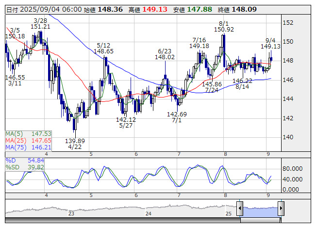 米ドル/円 <日足> Slowストキャス 「株探」多機能チャートより3日のニューヨーク外為市場でドル・円は148円80銭から147円88銭まで下落し、148円13銭で引けた。連邦準備制度理事会(FRB)のウォラー理事が9月利下げ支持を再表明したほか、7月JOLT求人件数が予想を下回り、さらにFRBが公表した地区連銀経済報告(ベージュブック)で景気判断が下方修正されたため年内の利下げ観測を受けたドル売りに拍車がかかった。