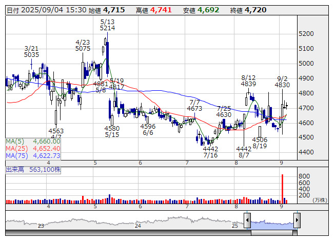 <9824> 泉州電業 4225 -255 ( -5.7%) 4431.0 4440.8