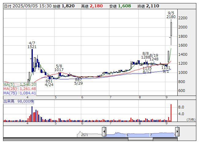 2. <9330> 揚羽 東証G 52.7倍 ( 1,423) 930 ( +6.8 ) 人工知能関連