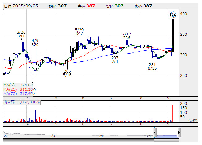 IGS <日足> 「株探」多機能チャートより■IGS <4265> 387円 (+80円、+26.1%) ストップ高
