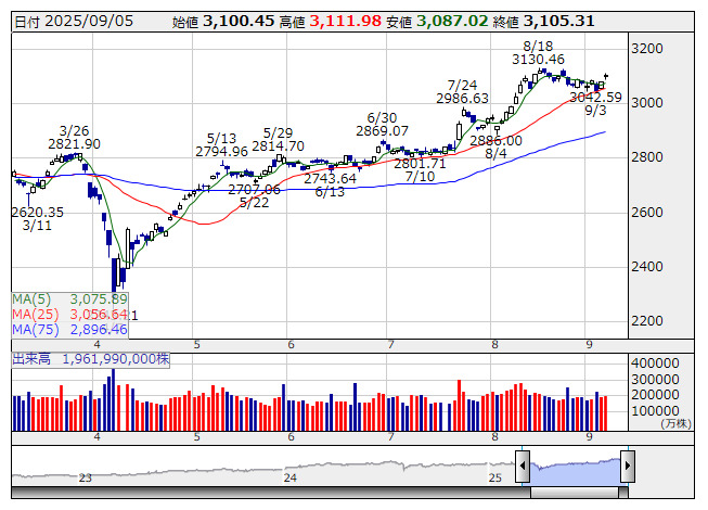 2025年09月08日08時46分 【市況】TOPIX先物:8日寄り付き=40.5ポイント高、3150ポイント TOPIX <日足> 「株探」多機能チャートより 8日8時45分、TOPIX先物期近2025年9月限は前週末清算値比40.5ポイント高の3150ポイントで寄り付いた。前週末のTOPIXの現物終値3105.31ポイントに対しては44.69ポイント高。 株探ニュース