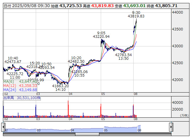 2025年09月08日09時35分 【市況】日経平均の上げ幅が800円突破 日経平均 <5分足> 「株探」多機能チャートより 日経平均株価の上げ幅が800円を突破。9時34分現在、801.08円高の4万3819.83円まで上昇している。 株探ニュース