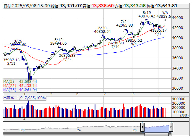 前週末5日の米国株式市場は軟調に推移。雇用統計を受け早期利下げ期待が強まり、寄り付き後、上昇。ただ、同時に予想を大幅に下回った結果で、景気後退入りを警戒した売りに押され、相場は下落に転じた。終日売り買いが交錯し、終盤にかけて下げ幅を縮小し、終了。米株式市場の動向を横目に、本日の日経平均は続伸して取引を開始した。前場は、7日に石破首相が辞任表明したことで財政拡張派の新政権誕生に期待する動きが強まり、買いが先行。ただ、43800円台に到達すると上値の重い展開となり、その後は大引けまで43600円台でもみ合う展開となった。政治の混乱で日銀が利上げに一段と慎重になるとの見方もあり、円安により輸出企業の業績が改善するとの期待も広がった。一方、高値圏では主力株に利益確定売りが出ており、来週に日米の中央銀行の金融政策決定会合を控えるなか、一段高の動きには期待しづらかった。