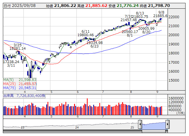 本日は伸び悩みか。来週のFOMCでは利下げ自体は織り込み済みで、25bpにとどまるか50bpに踏み込むかが焦点となっている。ただ、今週発表の消費者物価指数(CPI)の上振れや関税政策の影響が警戒材料。一方、雇用市場の減速を背景に追加利下げへの期待も根強く、投資家心理を支えている。新規失業保険申請件数なども視野に、金融政策見通しを占う材料が相次ぐ。セクター別では、高値圏にある主力ハイテクは利益確定売りが出やすい半面、金融やエネルギーなど出遅れ分野への資金シフトが意識される可能性がある。