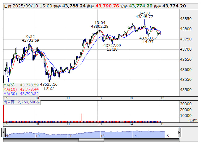 【市況】15時の日経平均は331円高の4万3790円、SBGが204.62円押し上げ
