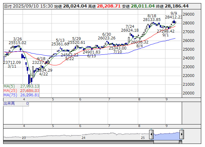 2025年09月10日15時47分 【市況】JPX日経400先物:10日清算値=185ポイント高、2万8240ポイント JPX日経400 <日足> 「株探」多機能チャートより 10日15時45分、JPX日経インデックス400先物期近2025年9月限は前日清算値比185ポイント高の2万8240ポイントで取引を終えた。出来高は3161枚だった。この日のJPX日経インデックス400の現物終値2万8186.44ポイントに対しては53.56ポイント高。 株探ニュース
