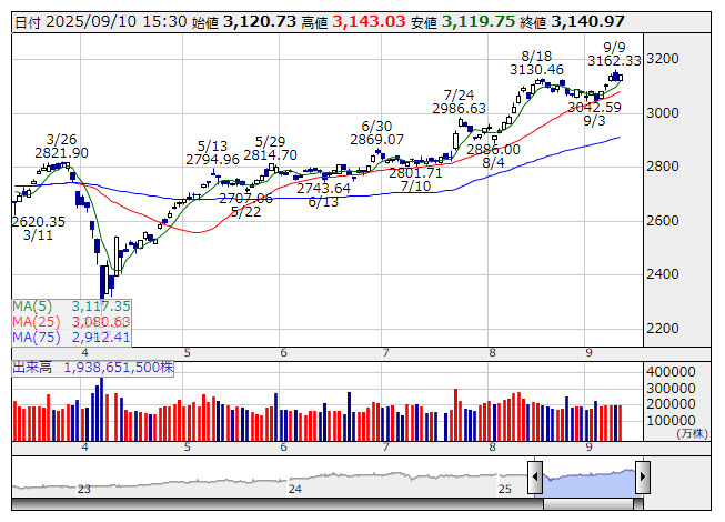 TOPIX <日足> 「株探」多機能チャートより日本取引所が公表した先物手口情報によると、9月10日のTOPIX先物期近(2025年9月限)の夜間取引(立会内・J-NETの合算)で、取引高トップはABNクリアリン証券の1万5222枚だった。