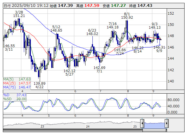 米ドル/円 <日足> Slowストキャス 「株探」多機能チャートより欧州市場でドル・円はやや軟調地合いとなり、147円30銭台まで値を下げた。米連邦公開市場委員会(FOMC)での大幅利下げ観測からドル売りに振れやすく、主要通貨は対ドルで上昇基調に。欧州株式市場はおおむねプラスで推移し、クロス円は下げづらい。