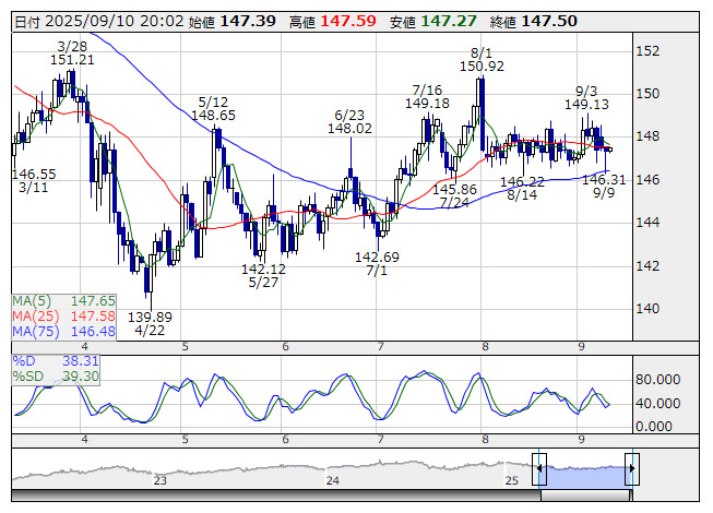 米ドル/円 <日足> Slowストキャス 「株探」多機能チャートより欧州市場でドル・円は底堅く推移し、147円半ばの水準を維持。146円台は買戻しで下値の堅さが意識されており、売りづらい。また、欧州株もおおむねプラスのため、円売りが続く。ただ、日銀の利上げ観測で円買い圧力は根強く、上値の重さも目立つ。
